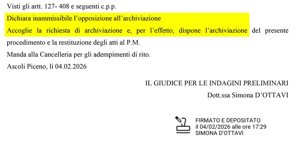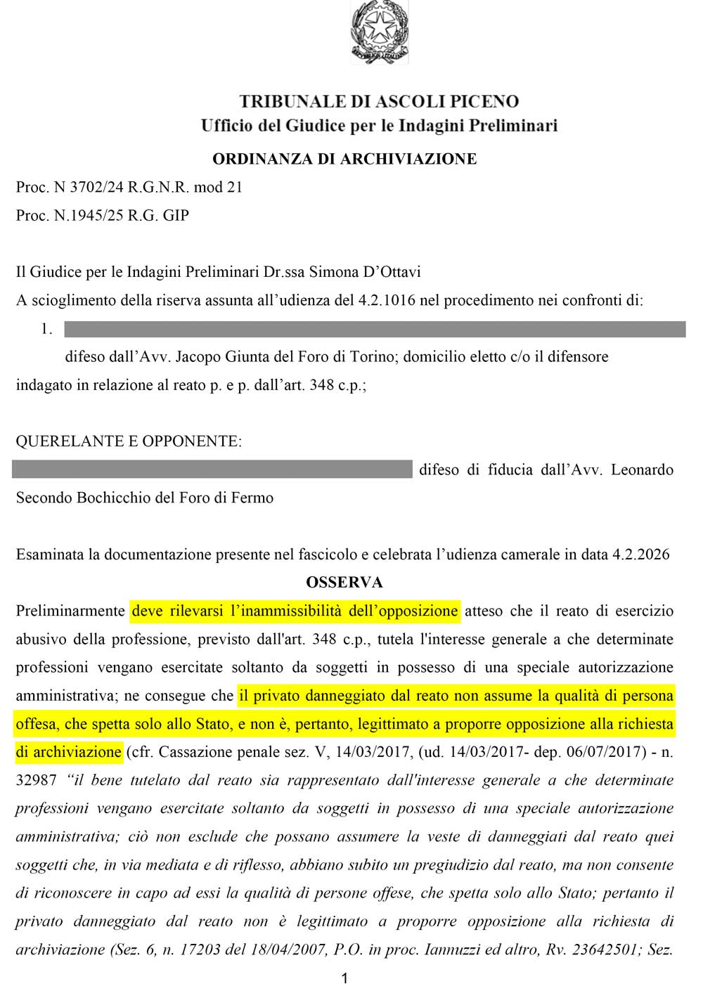 Nonostante questa abrogazione abbia di fatto tolto il fondamento legislativo alla pretesa del Collegio, la vicenda giudiziaria ha comunque seguito il suo corso, portando a una chiara e significativa Ordinanza di Archiviazione (del 04.02.2026, Proc. N 3702/24 R.G.N.R.) da parte del Giudice per le Indagini Preliminari, Dott.ssa Simona D’Ottavi.