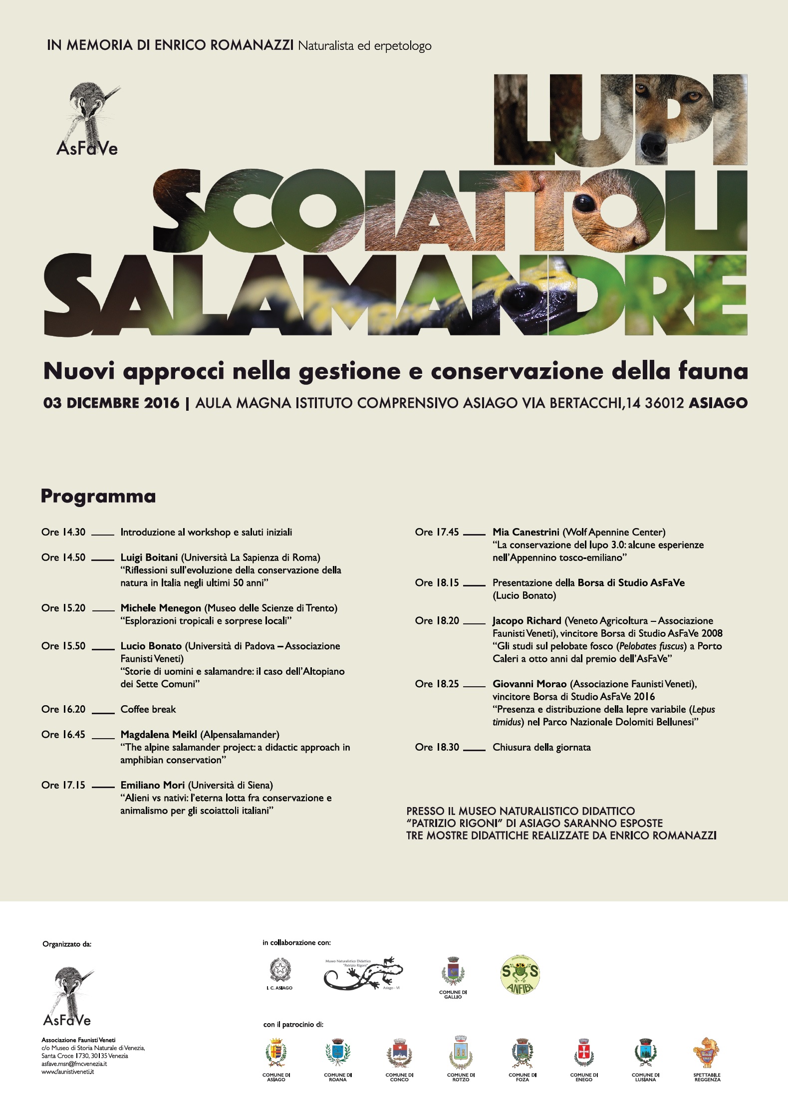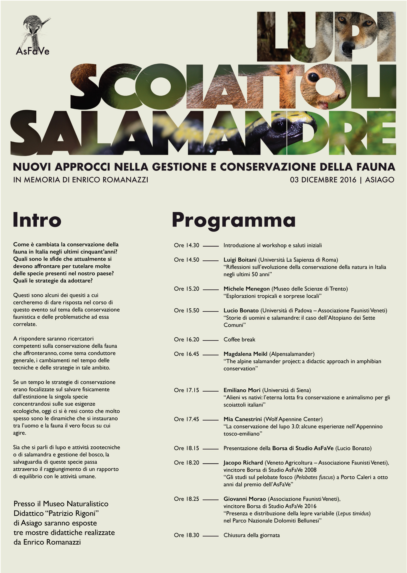 Come è cambiata la conservazione della fauna in Italia negli ultimi cinquant’anni? Quali sono le sfide che attualmente si devono affrontare per tutelare molte delle specie presenti nel nostro paese? Quali le strategie da adottare? Questi sono alcuni dei quesiti a cui cercheremo di dare risposta nel corso di questo evento sul tema della conservazione faunistica e delle problematiche ad essa correlate. A rispondere saranno ricercatori competenti sulla conservazione della fauna che affronteranno, come tema conduttore generale, i cambiamenti nel tempo delle tecniche e delle strategie in tale ambito. Se un tempo le strategie di conservazione erano focalizzate sul salvare fisicamente dall’estinzione la singola specie concentrandosi sulle sue esigenze ecologiche, oggi ci si è resi conto che molto spesso sono le dinamiche che si instaurano tra l’uomo e la fauna il vero focus su cui agire. Sia che si parli di lupo e attività zootecniche o di salamandra e gestione del bosco, la salvaguardia di queste specie passa attraverso il raggiungimento di un rapporto di equilibrio con le attività umane.