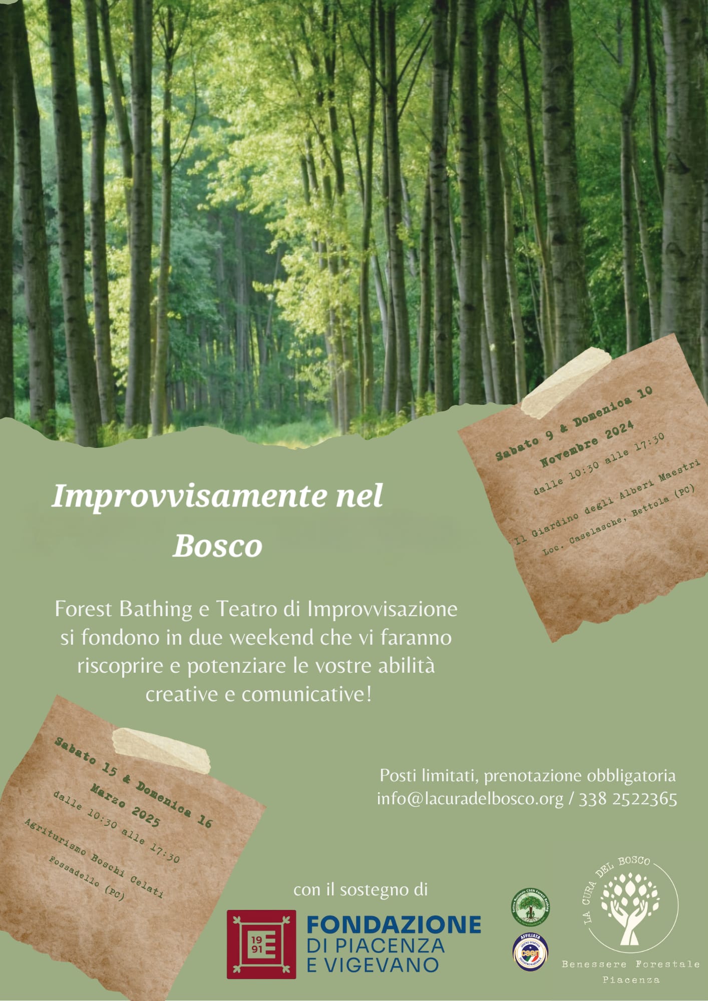 Il progetto, sostenuto dalla Fondazione di Piacenza e Vigevano, si sviluppa in due weekend all’insegna dell’improvvisazione coniugata alle pratiche di Forest Bathing, potenziando attraverso divertenti esercizi le competenze espressive, emotive e comunicative dei partecipanti in un ambiente, il bosco, che offre nuove forme creative e di benessere.