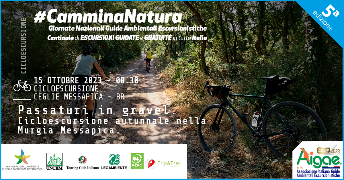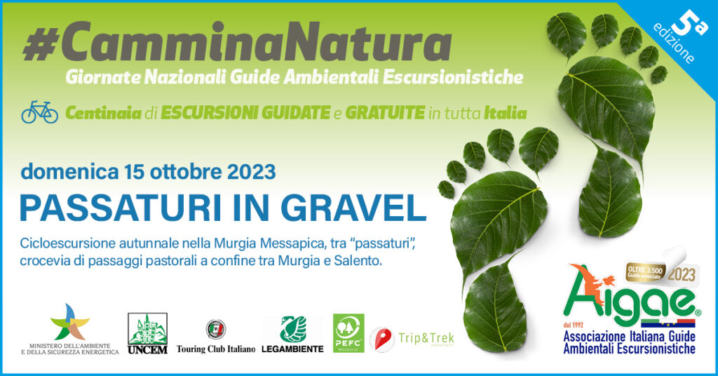 Descrizione: i “passaturi” crocevia di passaggi pastorali tra le terre messapiche a confine tra Murgia e Salento, vere e proprie arterie rurali ricche di natura e storia. Attraverseremo, in bicicletta, questa fitta rete tra architettura rurale, querce e colline. Non mancherà un momento di promozione all’attività delle guide AIGAE con banchetto informativo sulle attività di Aigae e relativa professionalità.