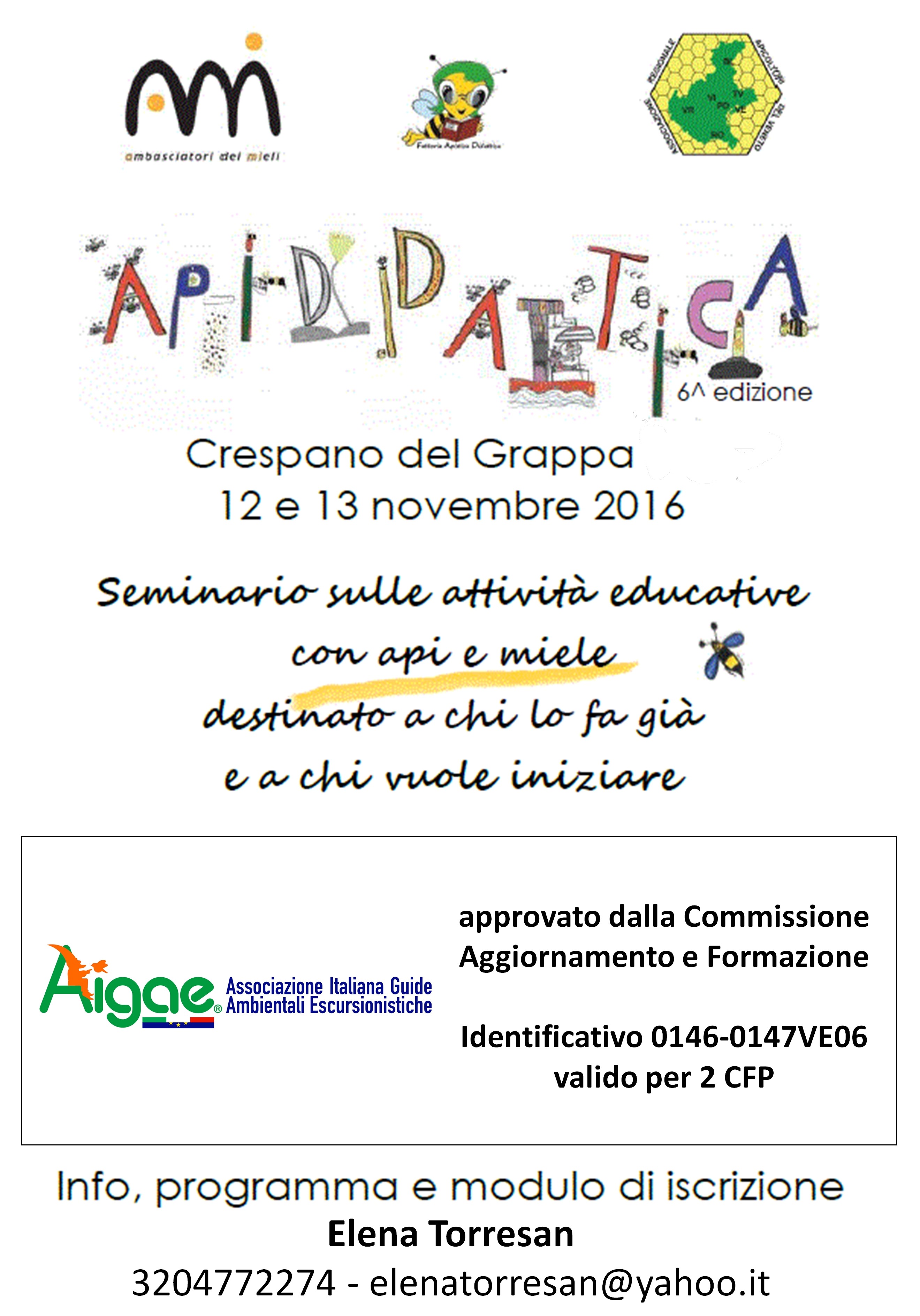 Un nuovo appuntamento (VI edizione) dedicato alla didattica e all’educazione attraverso il tema api ed apicoltura, si terrà in Veneto, una delle regioni all’avanguardia nella diffusione e regolamentazione delle attività educative e sociali legate all’agricoltura. Oltre alla promozione della condivisione di esperienze e materiali, utile alla crescita personale e collettiva, quest’anno saranno organizzati tre moduli diversi e complementari. Una prima parte sarà ricca di contenuti tecnici, con un’apertura alle esperienze di altri Paesi. Il pomeriggio di sabato sarà dedicato alle esperienze degli operatori delle Fattorie Apistiche Didattiche. La domenica sarà dedicata tema dell’agricoltura sociale, chiudendo l’evento presso la Bio Fattoria Sociale Conca d’Oro.