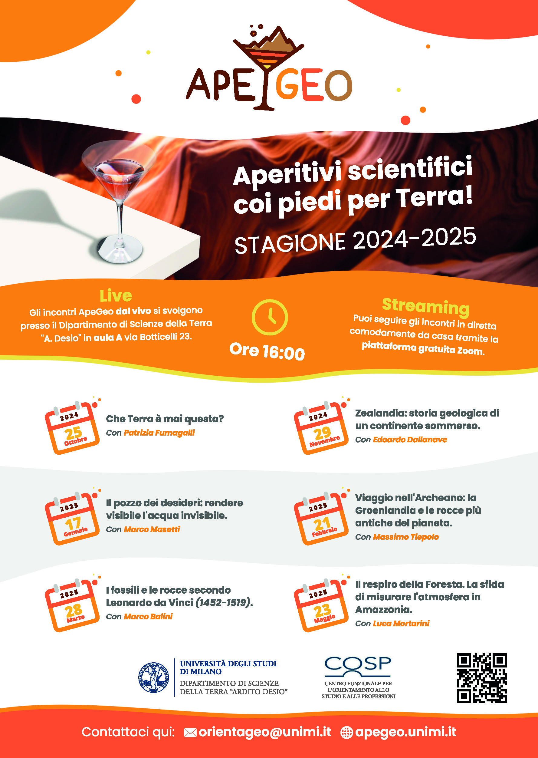 “ApeGeo, aperitivi scientifici coi piedi per Terra” è un ciclo di seminari divulgativi e di approfondimento scientifico sulle Scienze della Terra. Chiacchiere scientifiche e spunti didattici, in un ambiente informale, per conoscere il Pianeta che ci ospita, in compagnia di studiosi e ricercatori del Dipartimento di Scienze della Terra “A. Desio”.