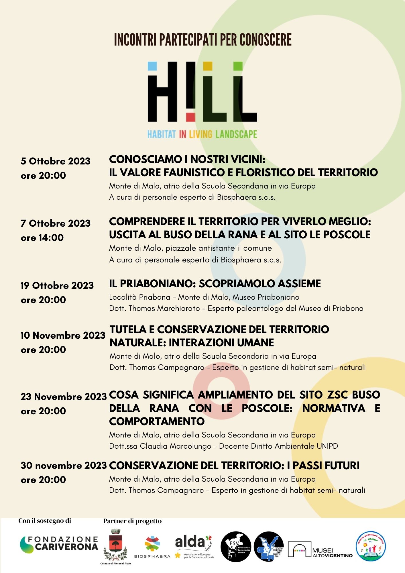 HILL è un progetto nel quale il Comune di Monte di Malo è il capofila, i partner operativi sono Biosphaera s.c.s. , Alda Italia A. P. S. , Federazione Speleologica Veneta e GSM Malo, in collaborazione ai partner associati Musei Altovicentino e Istituto Comprensivo Statale G. Ciscato, finanziato dal bando Habitat di Fondazione Cariverona.