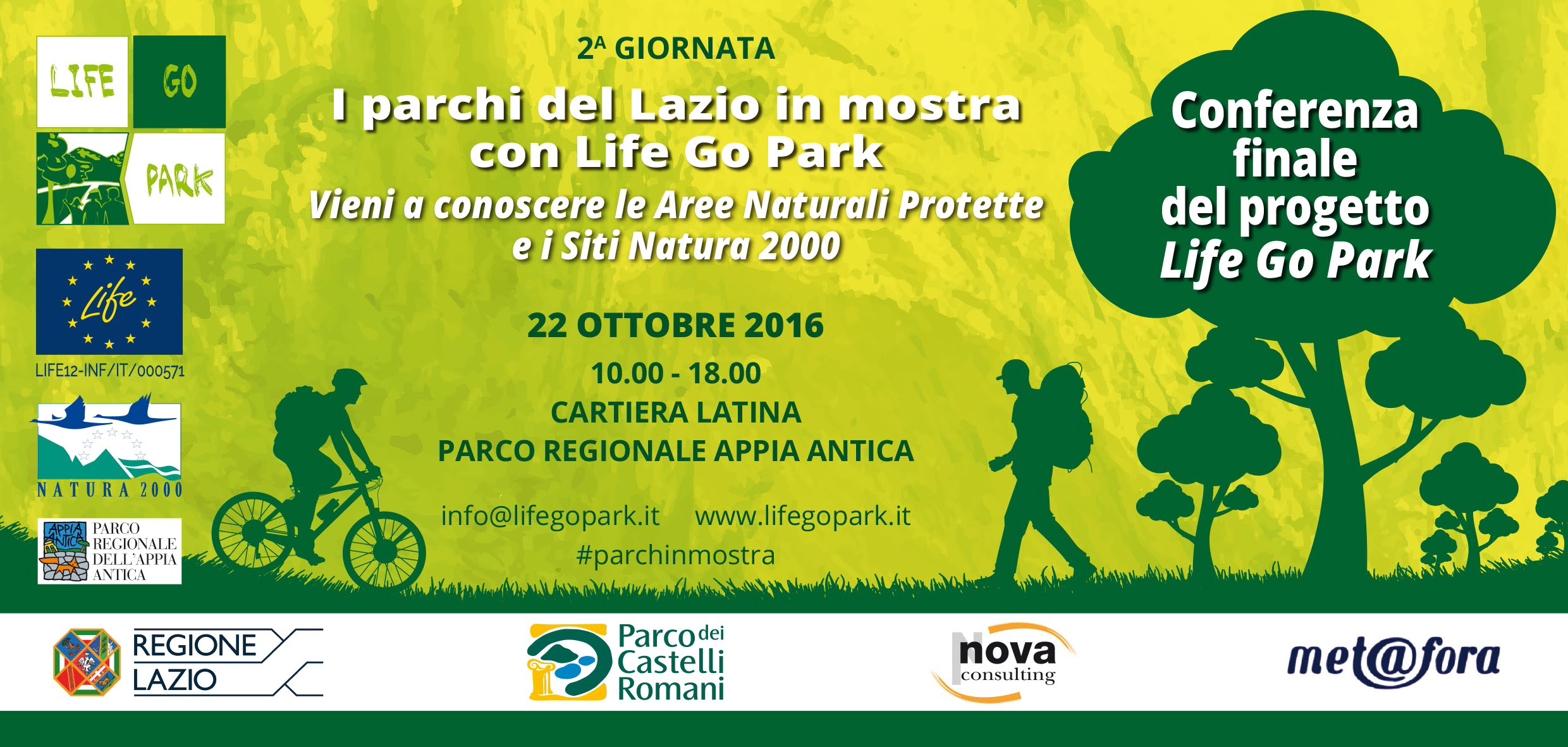 L’evento rappresenta il momento conclusivo del progetto Life Go Park, finanziato dalla Commissione Europea e dalla Regione Lazio e realizzato sotto il coordinamento della Direzione Regionale Ambiente e Sistemi Naturali; capofila del progetto è il Parco dei Castelli Romani, in partenariato con Nova Consulting srl e Metafora srl.