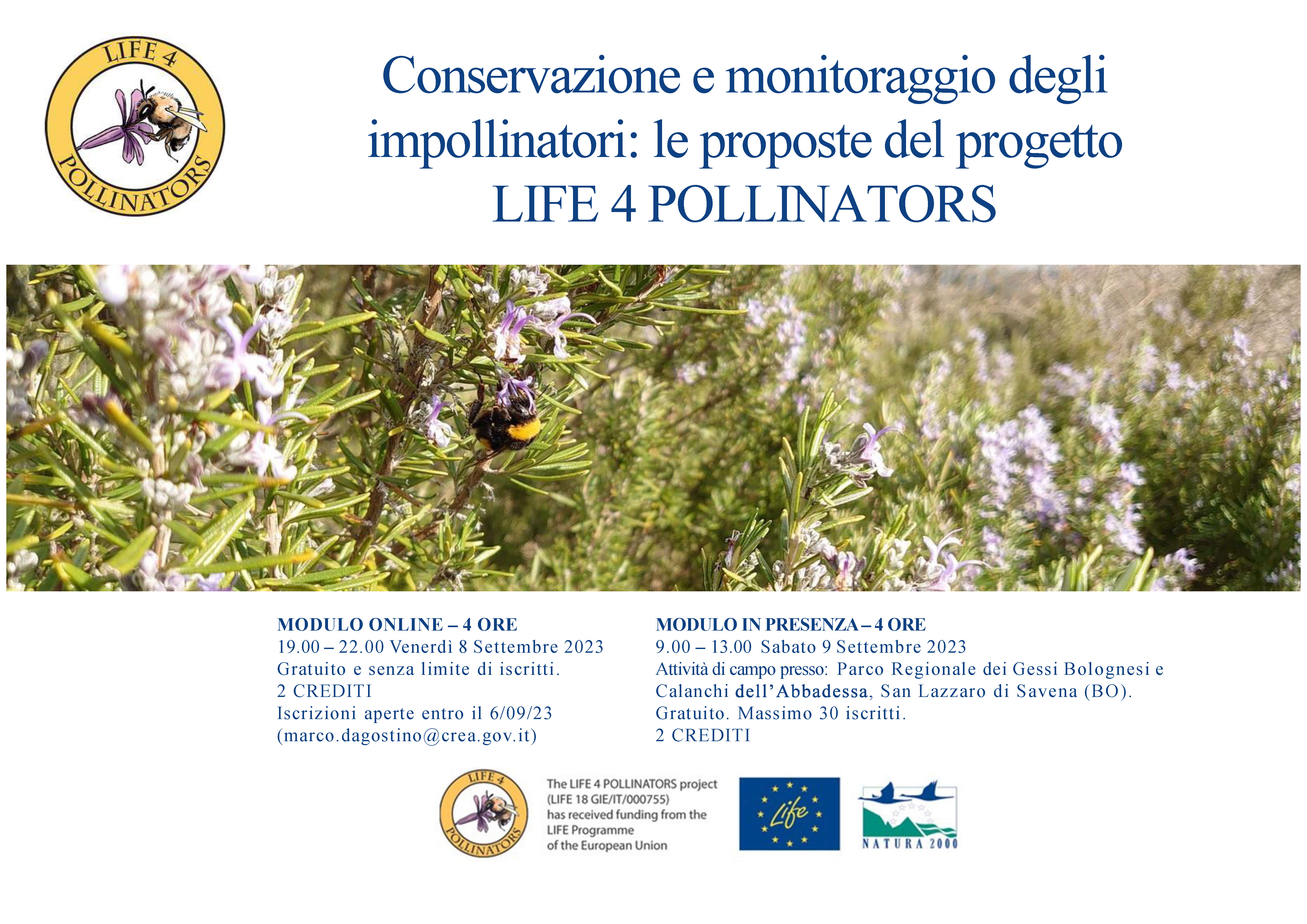 LIFE 4 Pollinators intende migliorare la conservazione degli insetti impollinatori e delle piante entomofile nella regione mediterranea, attraverso la creazione di un circolo virtuoso che porti a cambiamenti progressivi nelle pratiche antropiche che rappresentano le principali minacce per gli impollinatori. Per raggiungere questo obiettivo sono previsti eventi di sensibilizzazione del pubblico, attività di citizen science, di formazione e di coinvolgimento dei portatori di interessi dei settori chiave in quattro paesi europei (Italia, Grecia, Spagna e Slovenia). Il progetto è coordinato dall’Alma Mater Studiorum- Università di Bologna ed è cofinanziato dal fondo europeo LIFE.