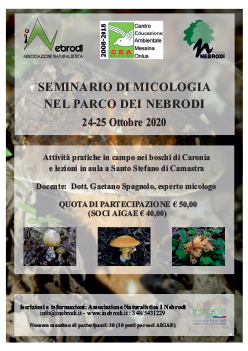 evento di due giorni a carattere didattico, con esperto micologo, attraverso lezioni frontali e attività pratiche in campo, avente l’obiettivo di fornire gli elementi base di conoscenza ed identificazione delle specie micologiche presenti nel territorio del Parco Regionale dei Nebrodi.