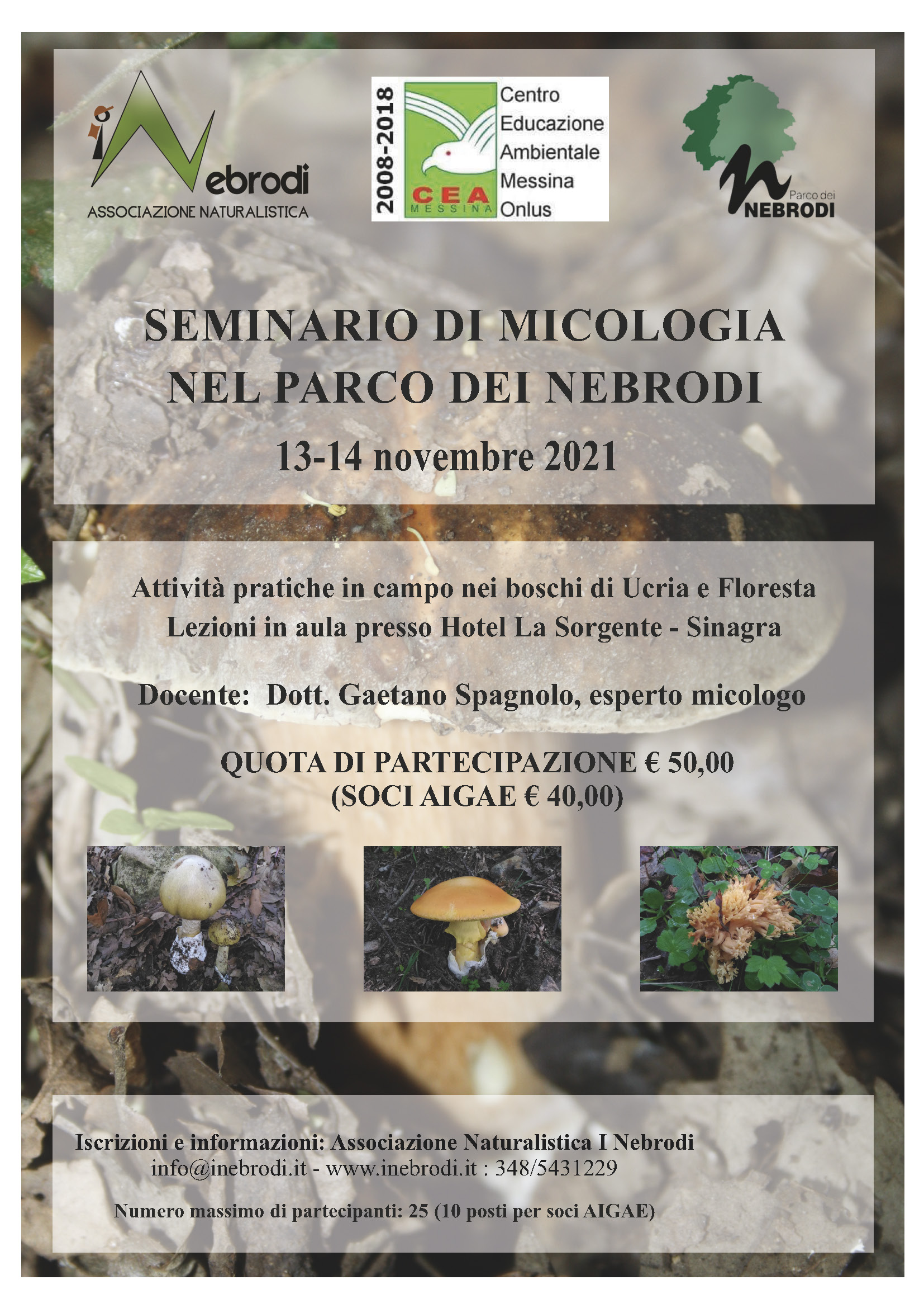 Quota di partecipazione € 50,00 (soci AIGAE € 40,00) comprensiva di visite guidate, attività didattiche teoriche e pratiche (in campo e in aula) con esperto micologo. Numero massimo 25 partecipanti.